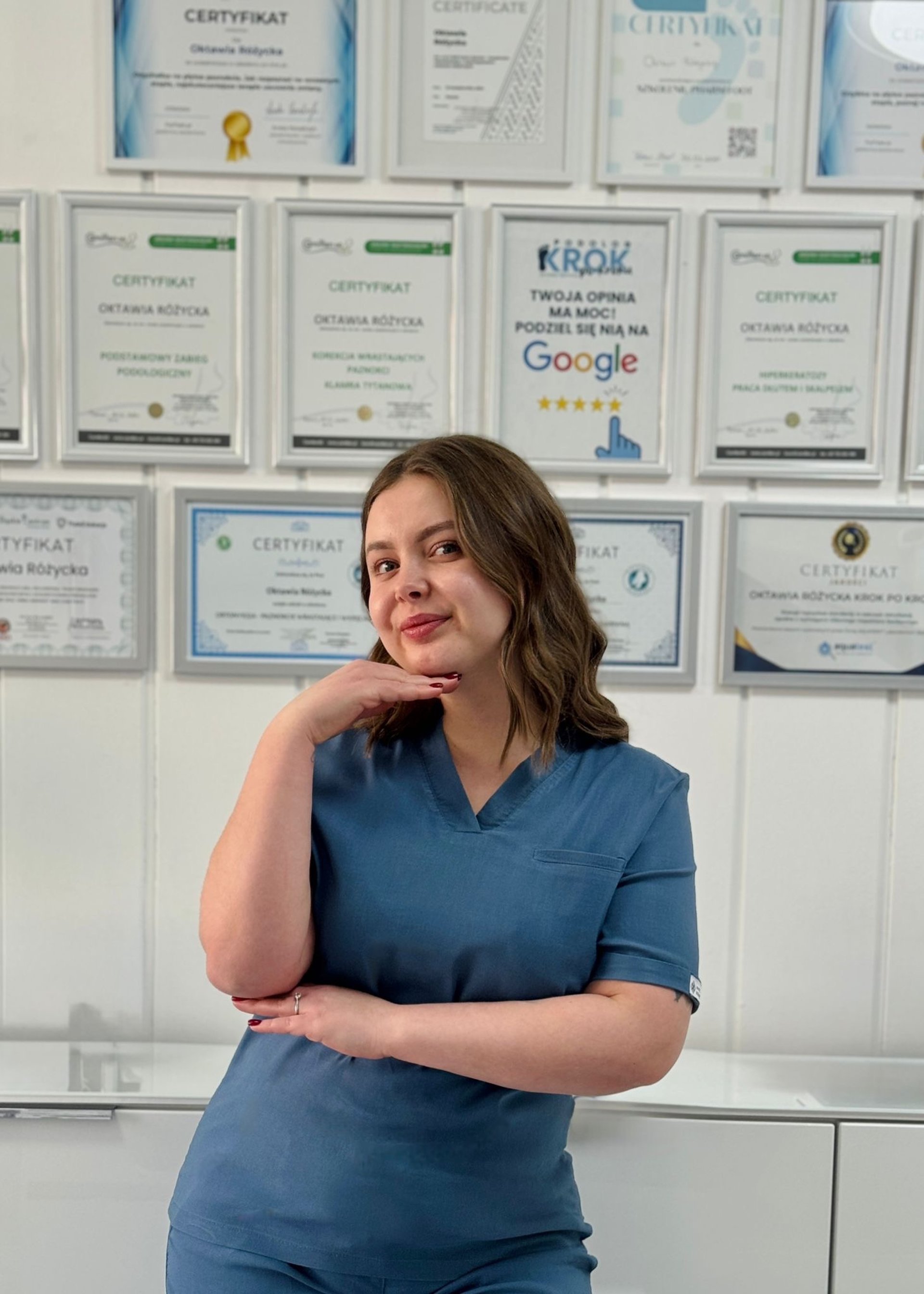 Nazywam się Oktawia Różycka, z zawodu jestem podologiem. Na co dzień prowadzę własny gabinet podologiczny w Gorzowie Wielkopolskim przy ul. Kosynierów Gdyńskich 31.